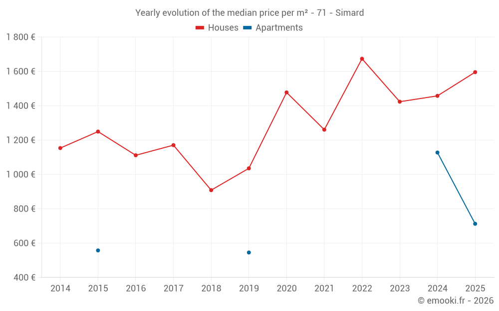 The median price on the 33 house transactions of the last 24 months in the municipality of Simard was 1 494 € per square meter for a median property value of 149 000 €. Over this period, 60% of transactions were between 928 and 2 133 € per square meter (from the 2nd to the 8th deciles).