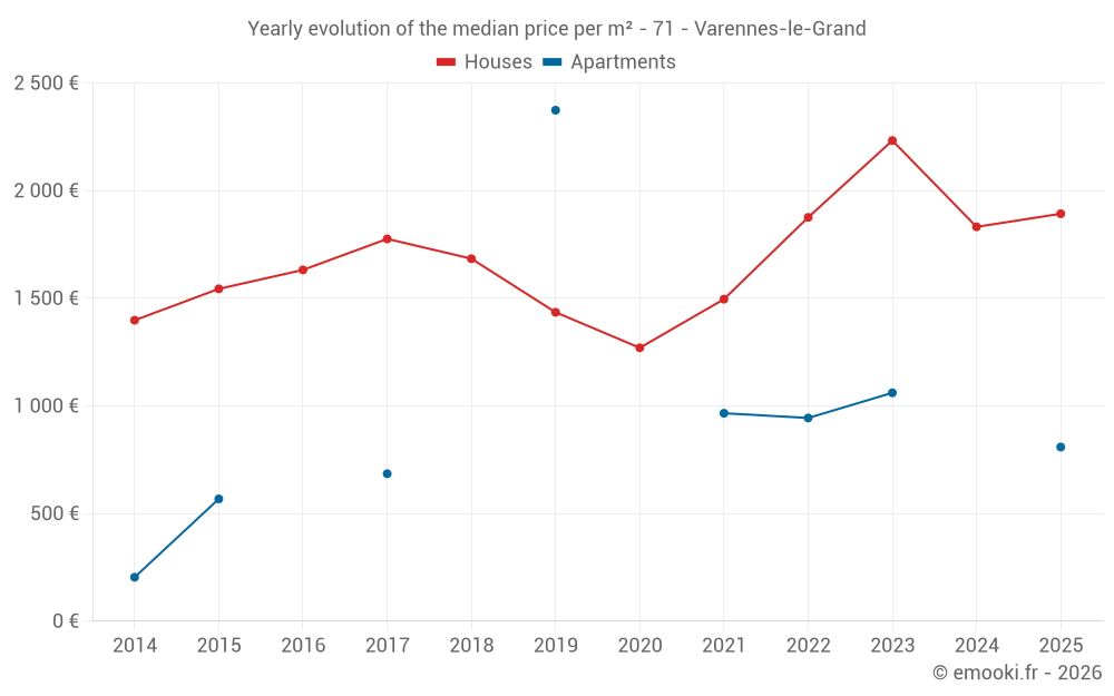 The median price on the 20 house transactions of the last 12 months in the municipality of Varennes-le-Grand was 1 824 € per square meter for a median property value of 171 205 €. Over this period, 60% of transactions were between 1 110 and 2 123 € per square meter (from the 2nd to the 8th deciles).
