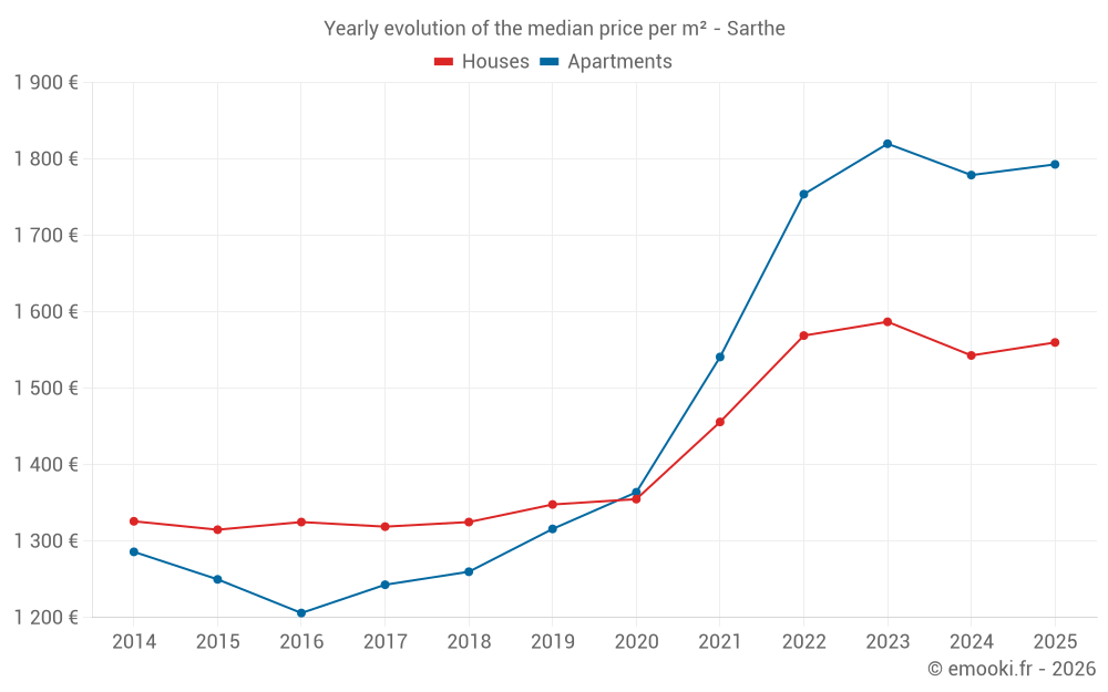 The median price on the 200 apartment transactions of the last 3 months in the Sarthe department was 1 752 € per square meter for a median property value of 90 047 €. Over this period, 60% of transactions were between 1 135 and 2 268 € per square meter (from the 2nd to the 8th deciles).