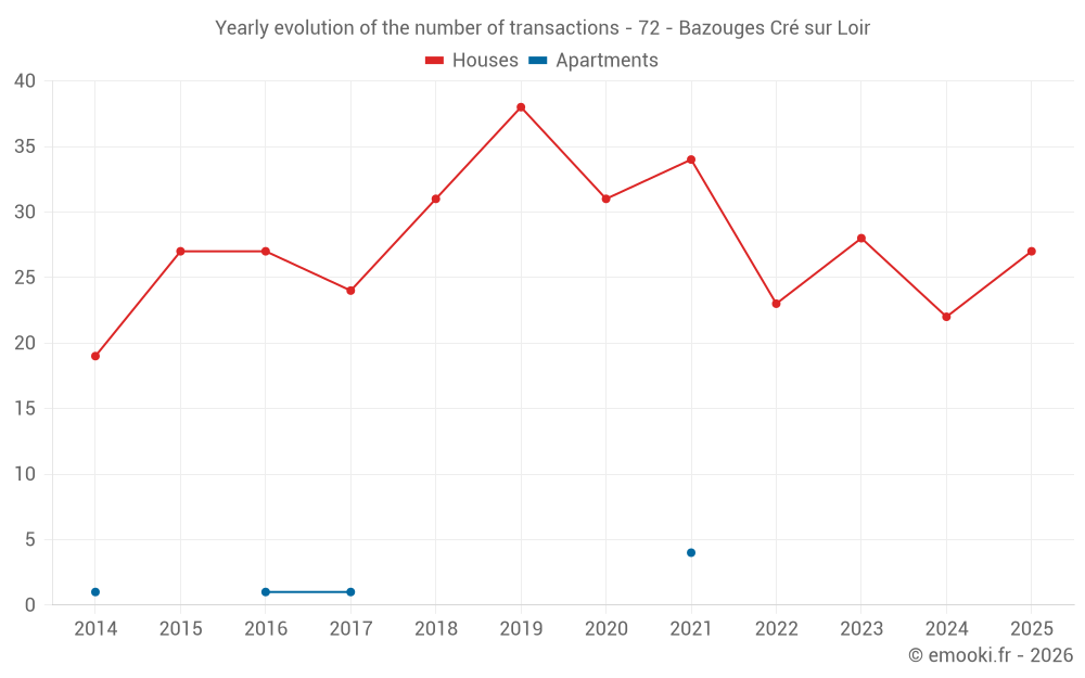 The median price on the 27 house transactions of the last 12 months in the municipality of Bazouges Cré sur Loir was 1 560 € per square meter for a median property value of 157 000 €. Over this period, 60% of transactions were between 974 and 1 935 € per square meter (from the 2nd to the 8th deciles).