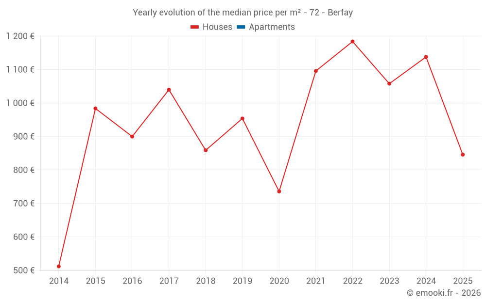 The median price on the 16 house transactions of the last 24 months in the municipality of Berfay was 1 052 € per square meter for a median property value of 80 625 €. Over this period, 60% of transactions were between 544 and 1 348 € per square meter (from the 2nd to the 8th deciles).