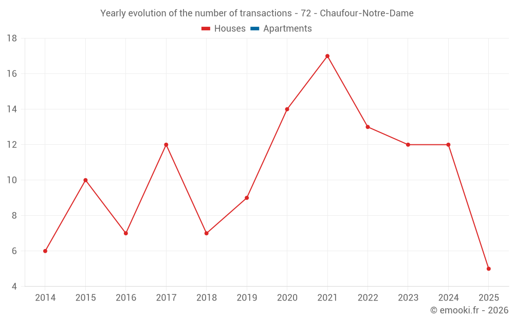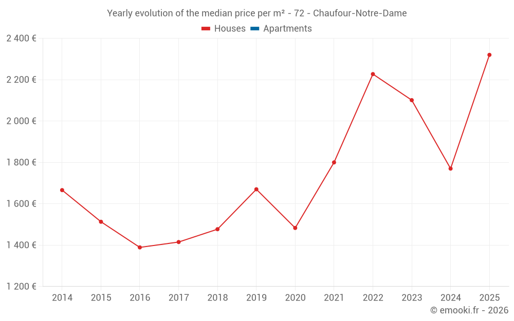 The median price on the 18 house transactions of the last 24 months in the municipality of Chaufour-Notre-Dame was 1 866 € per square meter for a median property value of 178 625 €. Over this period, 60% of transactions were between 1 426 and 2 242 € per square meter (from the 2nd to the 8th deciles).