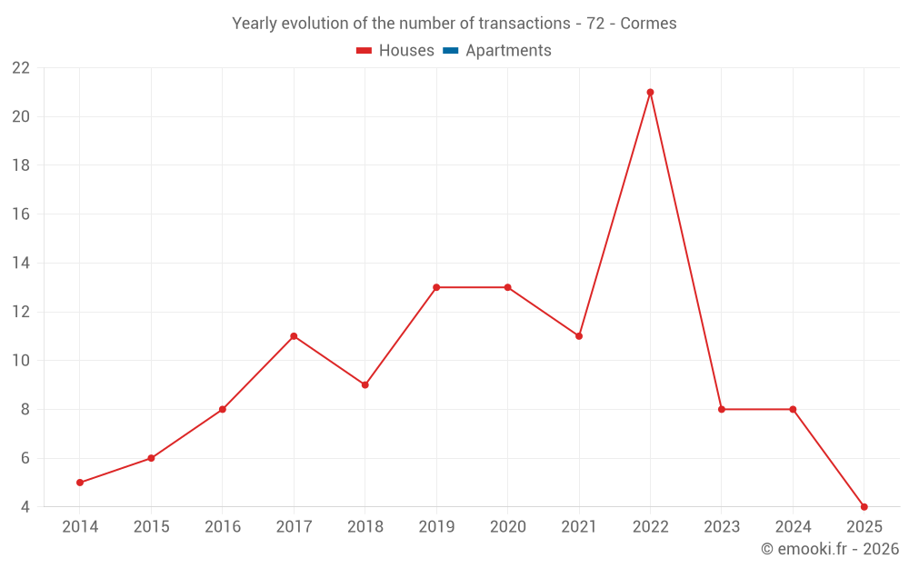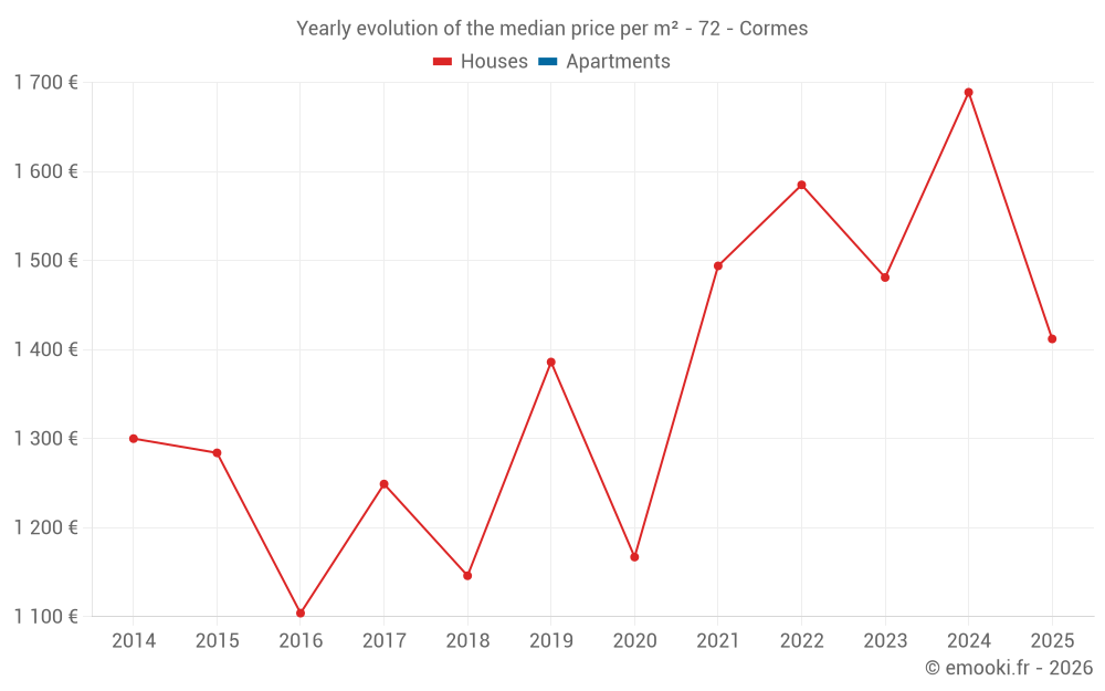 The median price on the 18 house transactions of the last 24 months in the municipality of Cormes was 1 616 € per square meter for a median property value of 171 575 €. Over this period, 60% of transactions were between 1 426 and 2 077 € per square meter (from the 2nd to the 8th deciles).