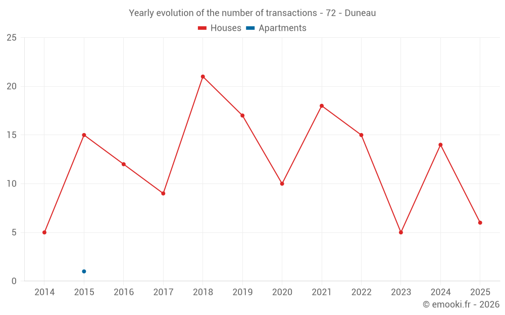 The median price on the 21 house transactions of the last 24 months in the municipality of Duneau was 1 588 € per square meter for a median property value of 172 000 €. Over this period, 60% of transactions were between 1 309 and 1 744 € per square meter (from the 2nd to the 8th deciles).