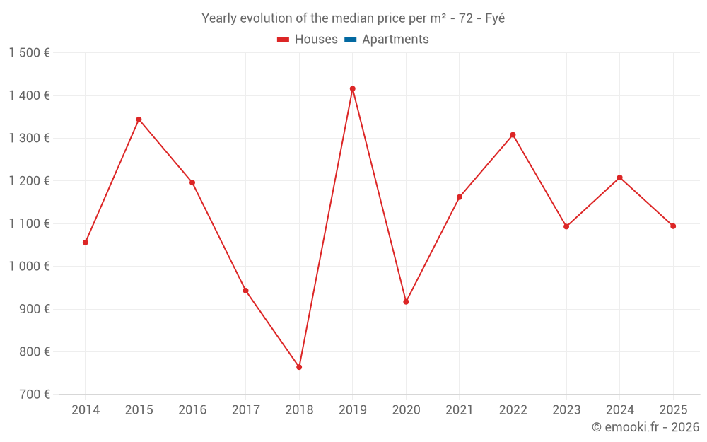The median price on the 17 house transactions of the last 24 months in the municipality of Fyé was 1 208 € per square meter for a median property value of 115 000 €. Over this period, 60% of transactions were between 795 and 1 364 € per square meter (from the 2nd to the 8th deciles).