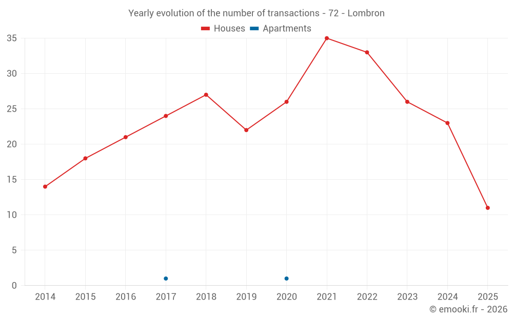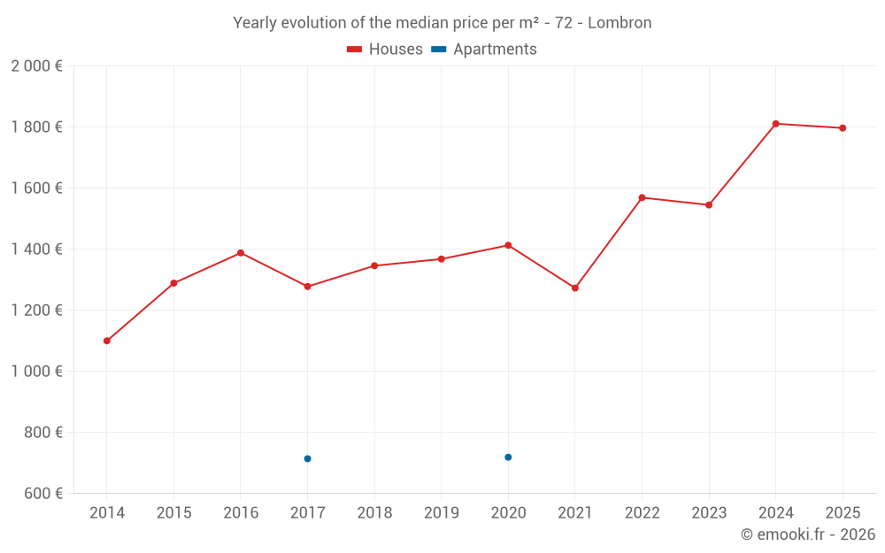 The median price on the 23 house transactions of the last 12 months in the municipality of Lombron was 1 924 € per square meter for a median property value of 180 000 €. Over this period, 60% of transactions were between 1 384 and 2 086 € per square meter (from the 2nd to the 8th deciles).