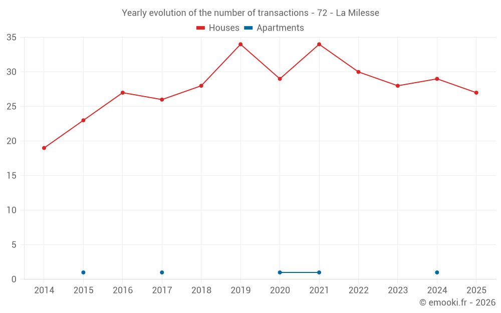 The median price on the 27 house transactions of the last 12 months in the municipality of La Milesse was 2 141 € per square meter for a median property value of 260 000 €. Over this period, 60% of transactions were between 1 659 and 2 492 € per square meter (from the 2nd to the 8th deciles).