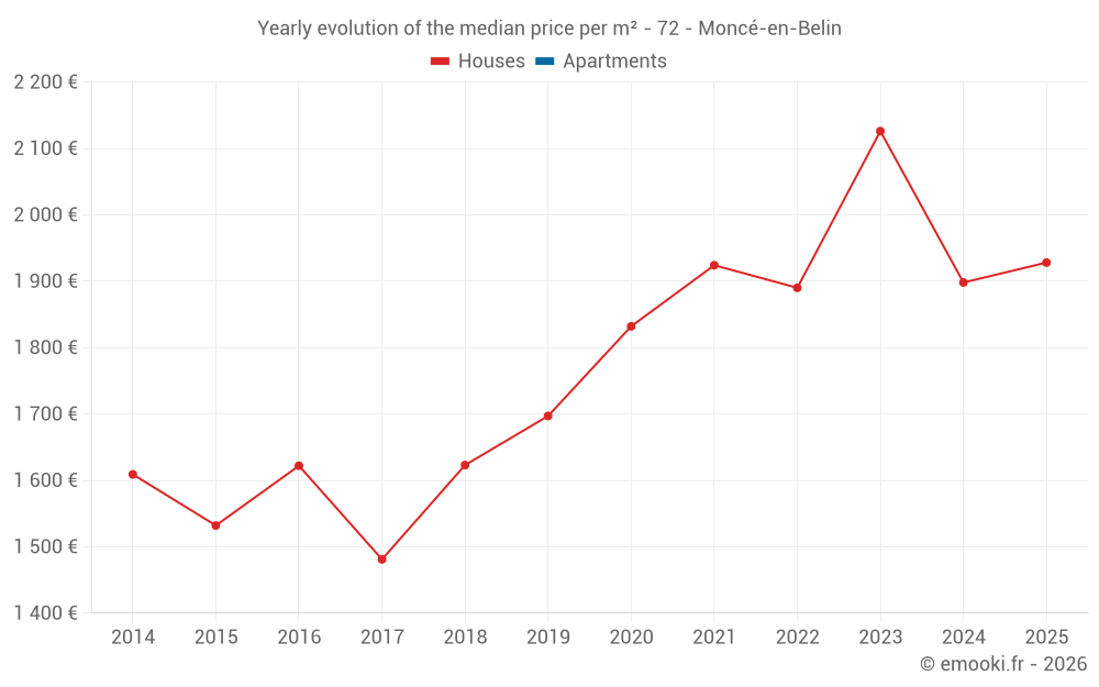 The median price on the 30 house transactions of the last 12 months in the municipality of Moncé-en-Belin was 1 916 € per square meter for a median property value of 189 500 €. Over this period, 60% of transactions were between 1 410 and 2 251 € per square meter (from the 2nd to the 8th deciles).