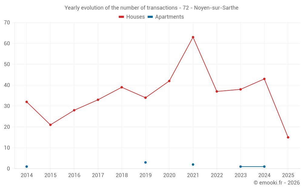 The median price on the 46 house transactions of the last 12 months in the municipality of Noyen-sur-Sarthe was 1 393 € per square meter for a median property value of 110 500 €. Over this period, 60% of transactions were between 878 and 2 000 € per square meter (from the 2nd to the 8th deciles).