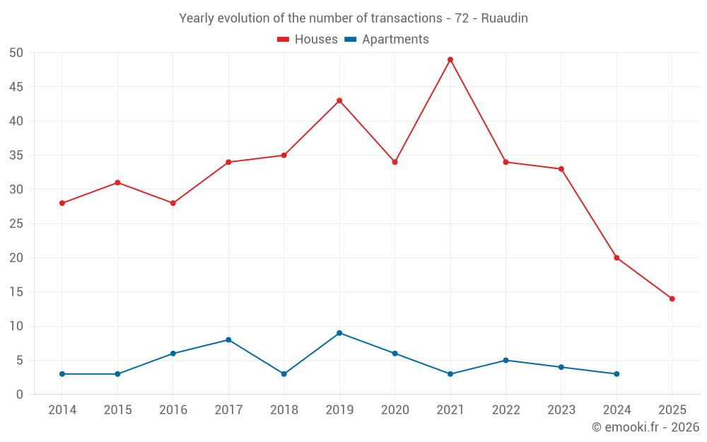 The median price on the 25 house transactions of the last 12 months in the municipality of Ruaudin was 2 167 € per square meter for a median property value of 225 000 €. Over this period, 60% of transactions were between 1 799 and 2 445 € per square meter (from the 2nd to the 8th deciles).