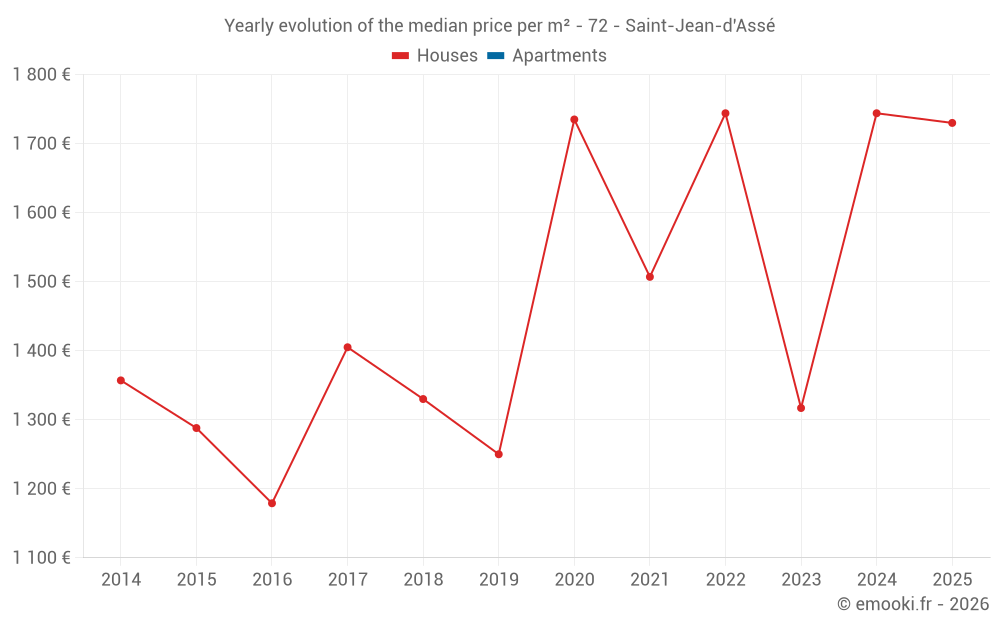 The median price on the 16 house transactions of the last 12 months in the municipality of Saint-Jean-d'Assé was 1 720 € per square meter for a median property value of 183 500 €. Over this period, 60% of transactions were between 1 517 and 1 952 € per square meter (from the 2nd to the 8th deciles).