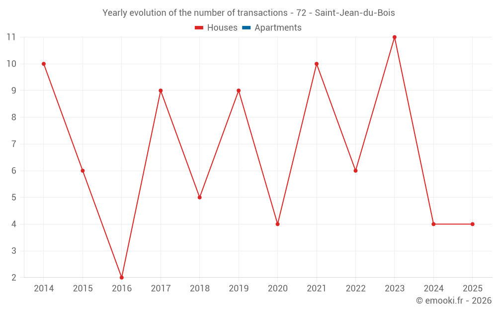 The median price on the 15 house transactions of the last 24 months in the municipality of Saint-Jean-du-Bois was 1 429 € per square meter for a median property value of 103 400 €. Over this period, 60% of transactions were between 1 044 and 1 723 € per square meter (from the 2nd to the 8th deciles).