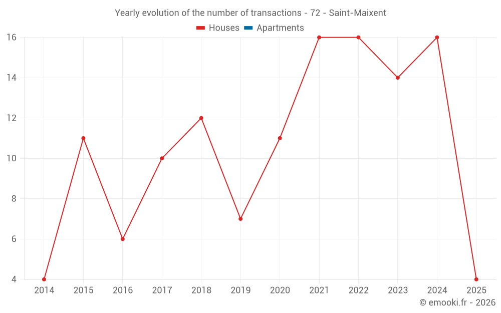 The median price on the 29 house transactions of the last 24 months in the municipality of Saint-Maixent was 1 167 € per square meter for a median property value of 88 000 €. Over this period, 60% of transactions were between 844 and 1 581 € per square meter (from the 2nd to the 8th deciles).
