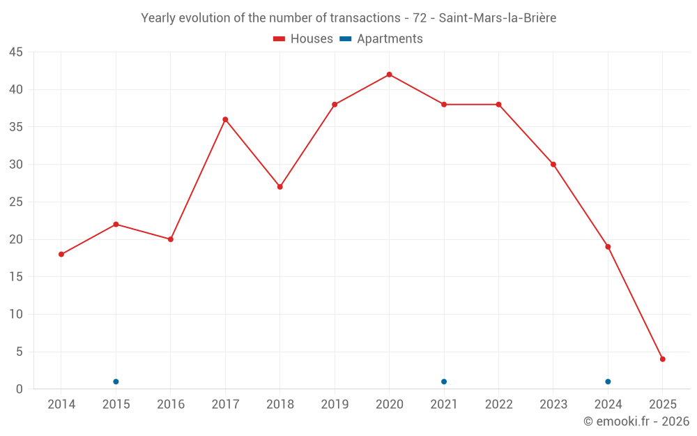 The median price on the 16 house transactions of the last 12 months in the municipality of Saint-Mars-la-Brière was 1 484 € per square meter for a median property value of 100 000 €. Over this period, 60% of transactions were between 1 237 and 1 954 € per square meter (from the 2nd to the 8th deciles).