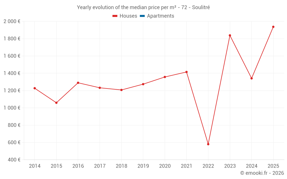 The median price on the 25 house transactions of the last 24 months in the municipality of Soulitré was 1 490 € per square meter for a median property value of 140 000 €. Over this period, 60% of transactions were between 702 and 1 885 € per square meter (from the 2nd to the 8th deciles).