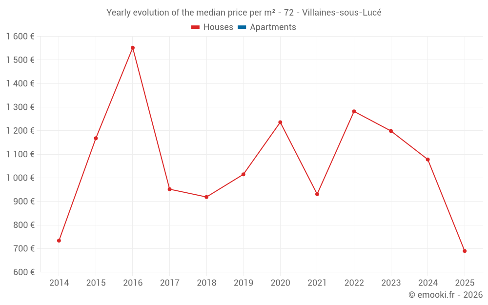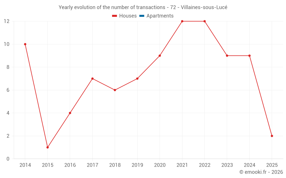 The median price on the 15 house transactions of the last 24 months in the municipality of Villaines-sous-Lucé was 1 078 € per square meter for a median property value of 120 000 €. Over this period, 60% of transactions were between 676 and 1 527 € per square meter (from the 2nd to the 8th deciles).