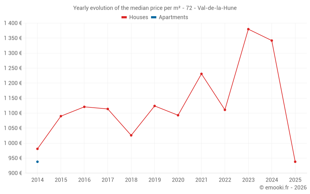 The median price on the 20 house transactions of the last 12 months in the municipality of Val-de-la-Hune was 1 103 € per square meter for a median property value of 109 500 €. Over this period, 60% of transactions were between 871 and 1 469 € per square meter (from the 2nd to the 8th deciles).