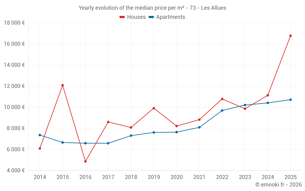 The median price on the 44 apartment transactions of the last 3 months in the municipality of Les Allues was 10 959 € per square meter for a median property value of 421 860 €. Over this period, 60% of transactions were between 9 204 and 13 663 € per square meter (from the 2nd to the 8th deciles).
