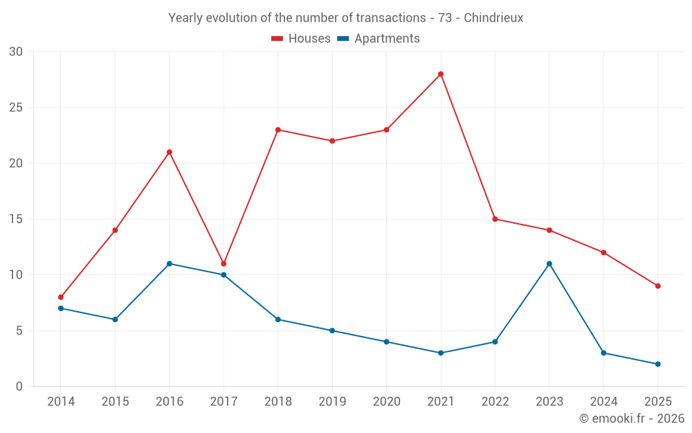 The median price on the 17 house transactions of the last 12 months in the municipality of Chindrieux was 3 429 € per square meter for a median property value of 355 000 €. Over this period, 60% of transactions were between 2 287 and 5 005 € per square meter (from the 2nd to the 8th deciles).