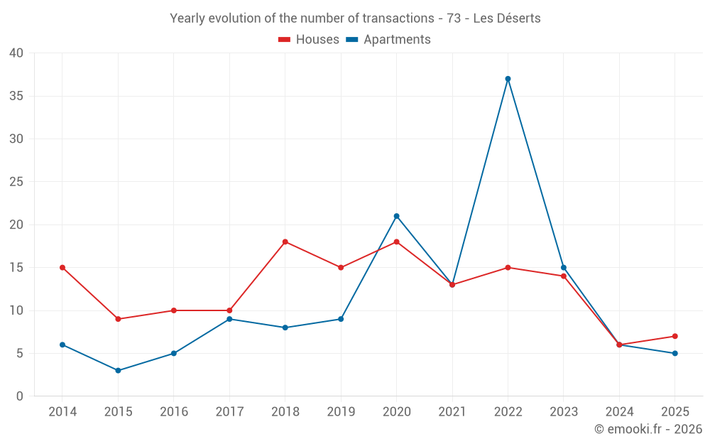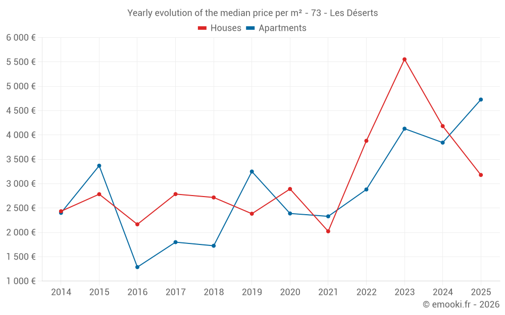 The median price on the 18 apartment transactions of the last 24 months in the municipality of Les Déserts was 4 538 € per square meter for a median property value of 182 625 €. Over this period, 60% of transactions were between 3 537 and 5 548 € per square meter (from the 2nd to the 8th deciles).