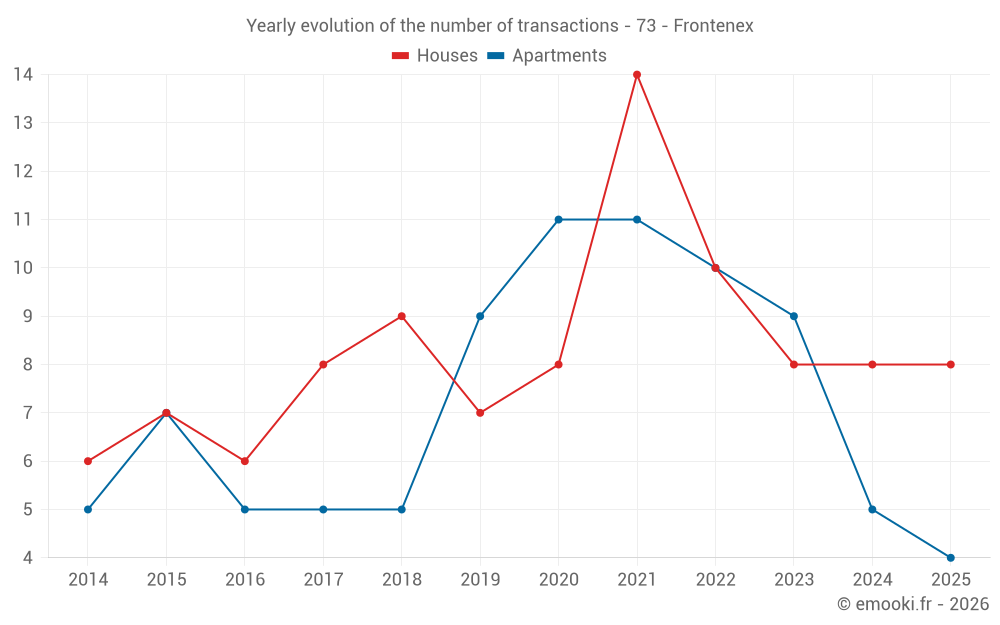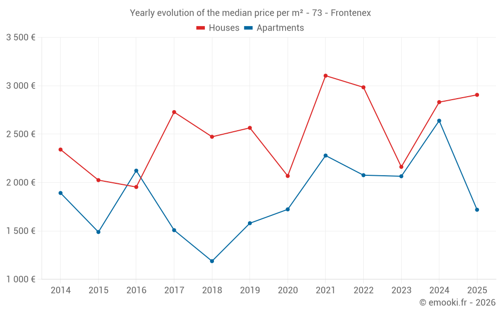 The median price on the 18 house transactions of the last 24 months in the municipality of Frontenex was 2 880 € per square meter for a median property value of 351 600 €. Over this period, 60% of transactions were between 2 228 and 3 426 € per square meter (from the 2nd to the 8th deciles).