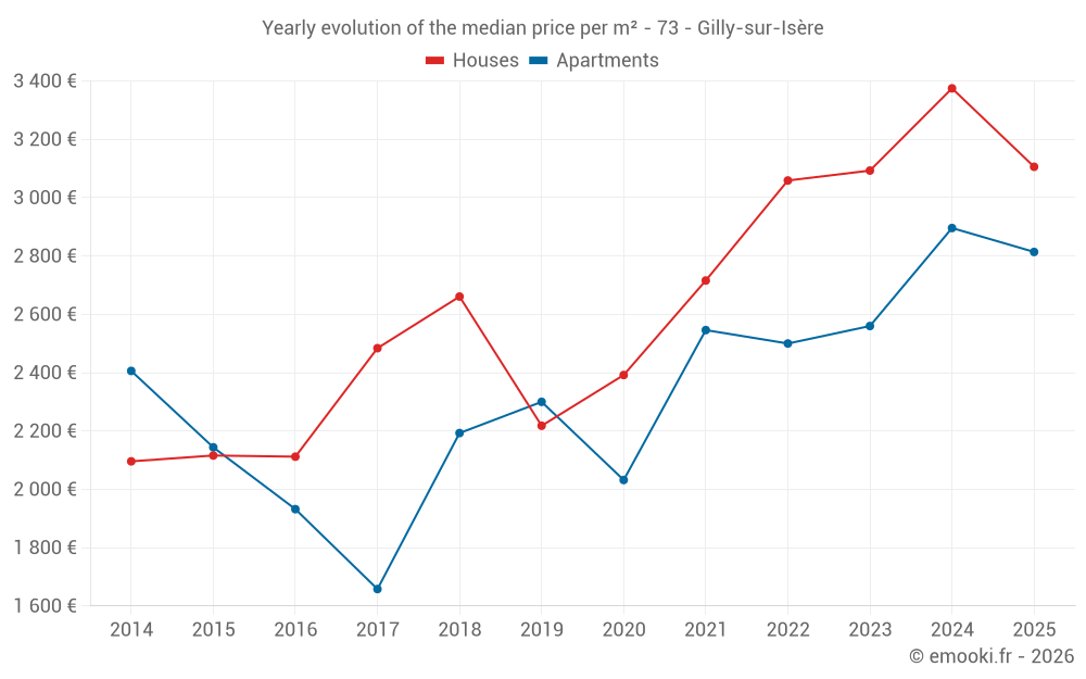 The median price on the 17 house transactions of the last 12 months in the municipality of Gilly-sur-Isère was 3 333 € per square meter for a median property value of 330 000 €. Over this period, 60% of transactions were between 2 614 and 3 837 € per square meter (from the 2nd to the 8th deciles).