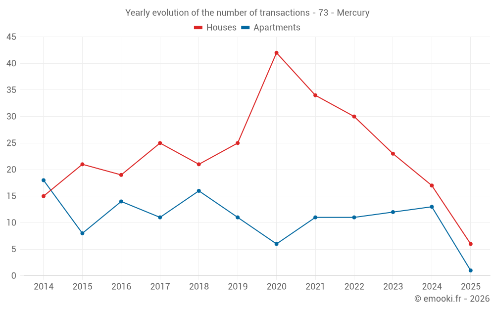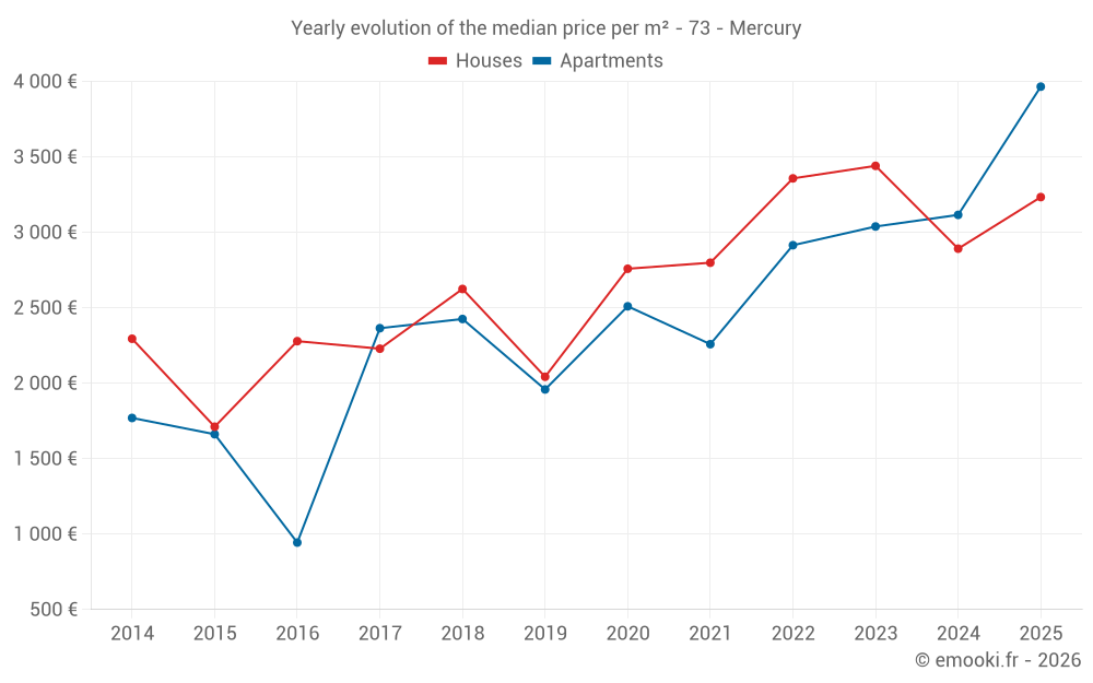 The median price on the 18 apartment transactions of the last 24 months in the municipality of Mercury was 3 101 € per square meter for a median property value of 208 400 €. Over this period, 60% of transactions were between 1 824 and 3 594 € per square meter (from the 2nd to the 8th deciles).
