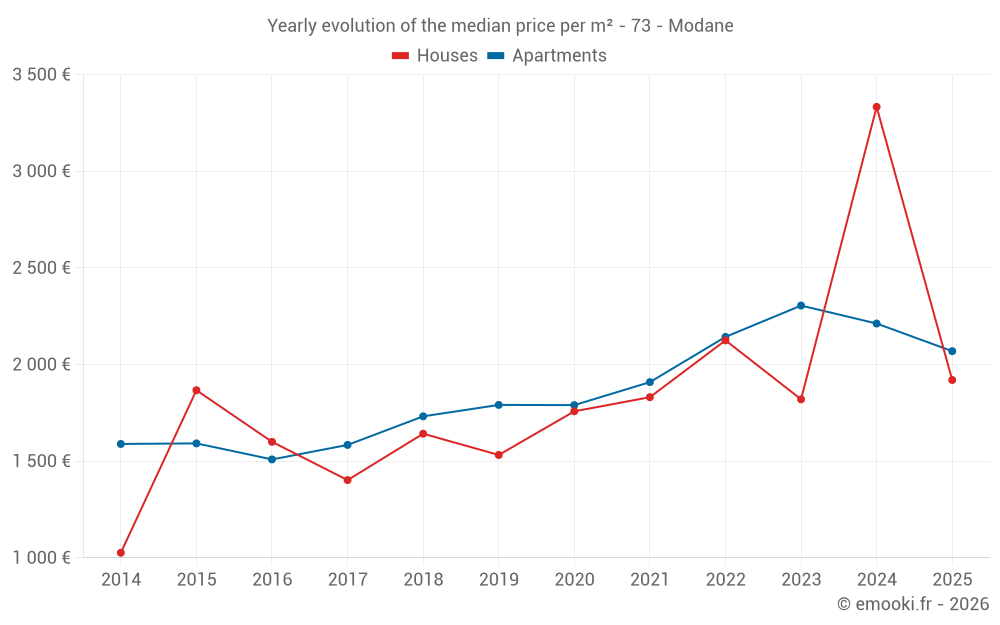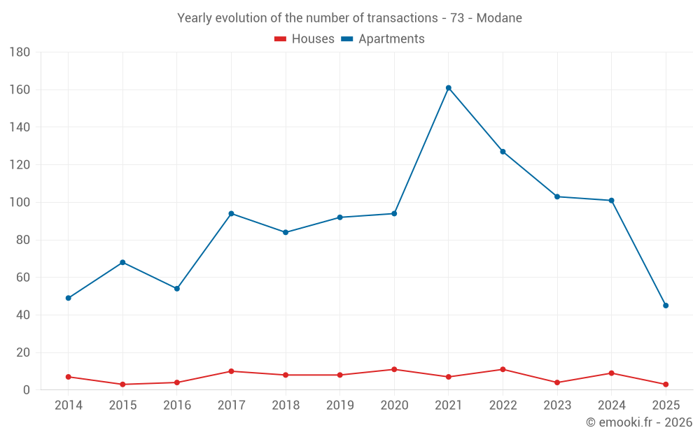 The median price on the 14 house transactions of the last 24 months in the municipality of Modane was 2 668 € per square meter for a median property value of 228 575 €. Over this period, 60% of transactions were between 891 and 4 548 € per square meter (from the 2nd to the 8th deciles).