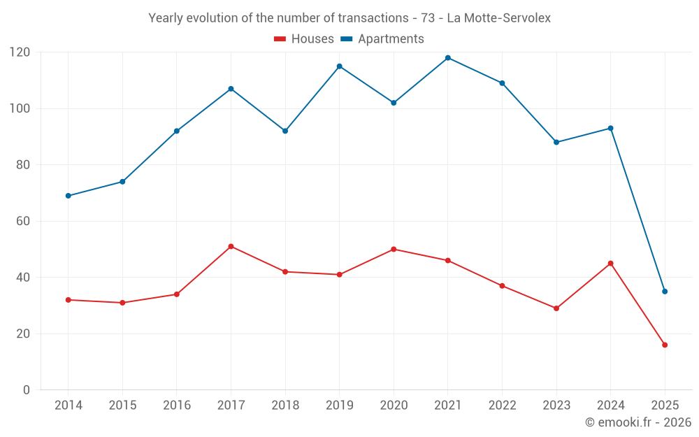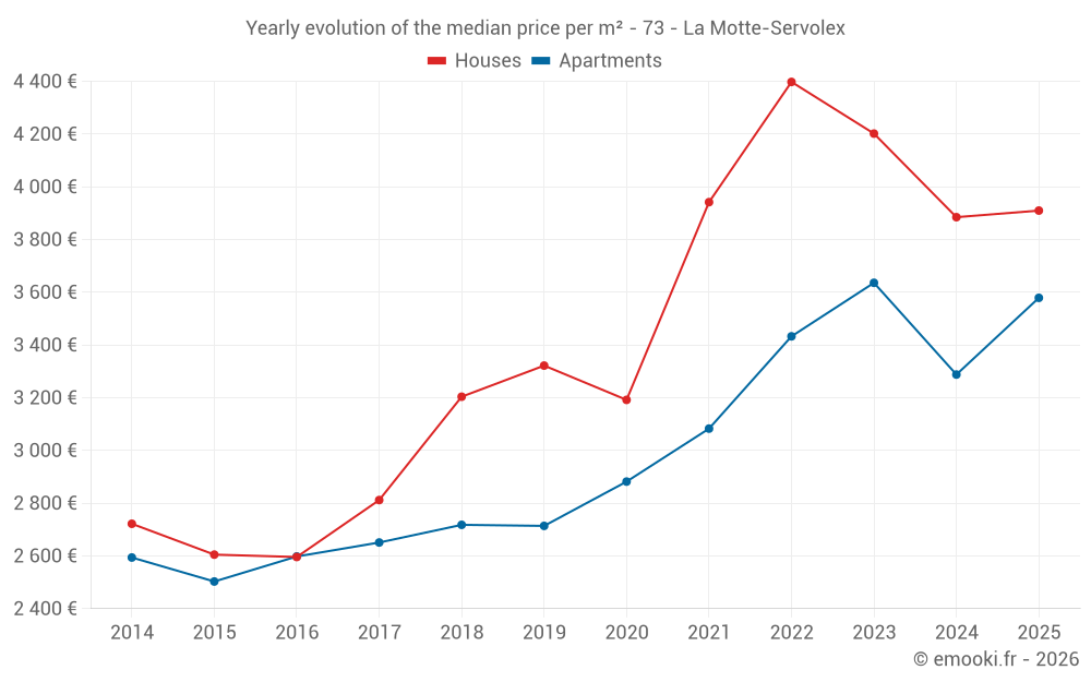 The median price on the 47 house transactions of the last 12 months in the municipality of La Motte-Servolex was 3 902 € per square meter for a median property value of 457 500 €. Over this period, 60% of transactions were between 3 100 and 4 762 € per square meter (from the 2nd to the 8th deciles).