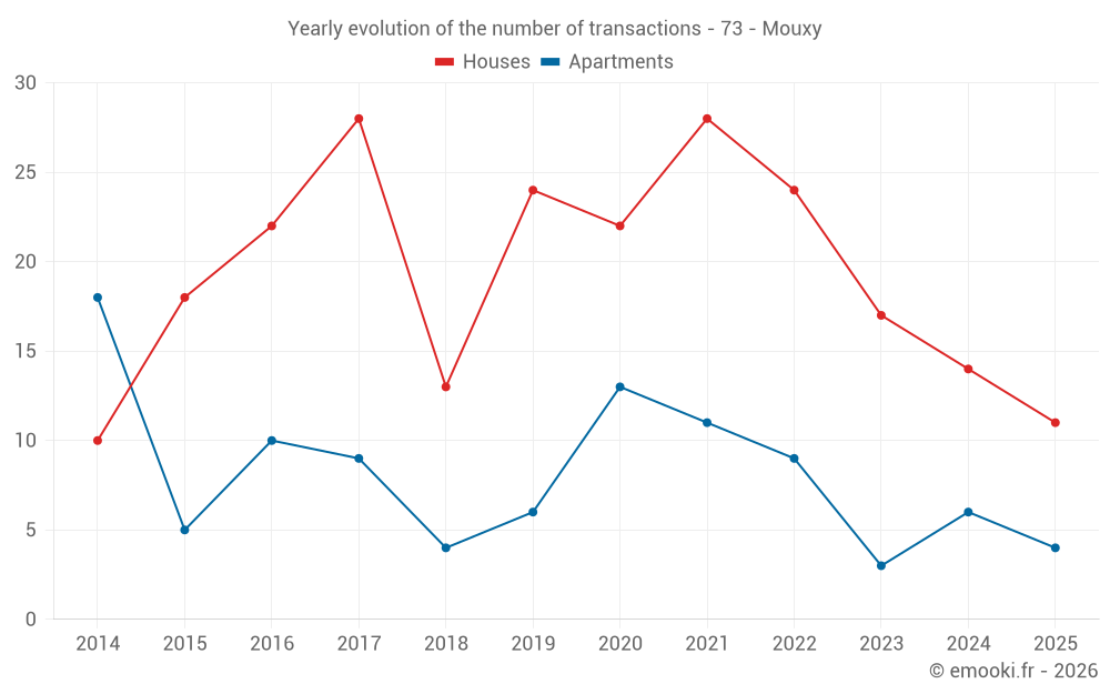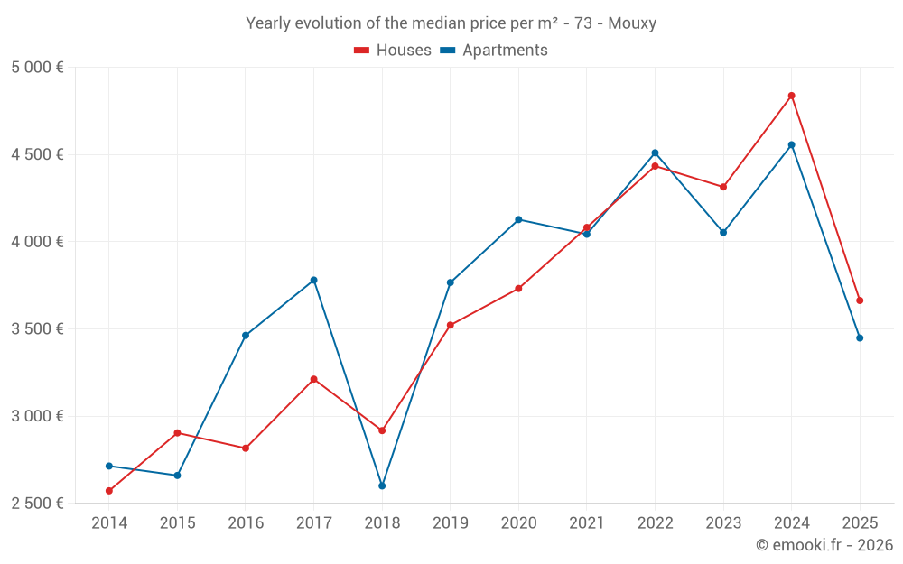 The median price on the 17 house transactions of the last 12 months in the municipality of Mouxy was 3 958 € per square meter for a median property value of 432 200 €. Over this period, 60% of transactions were between 2 724 and 4 903 € per square meter (from the 2nd to the 8th deciles).
