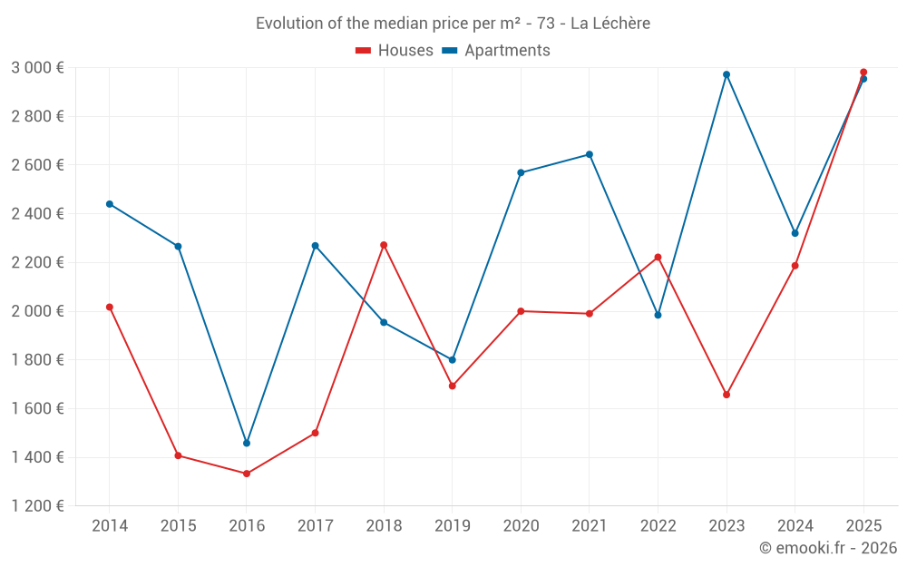 The median price on the 25 apartment transactions of the last 24 months in the municipality of La Léchère was 2 236 € per square meter for a median property value of 95 000 €. Over this period, 60% of transactions were between 1 482 and 3 069 € per square meter (from the 2nd to the 8th deciles).