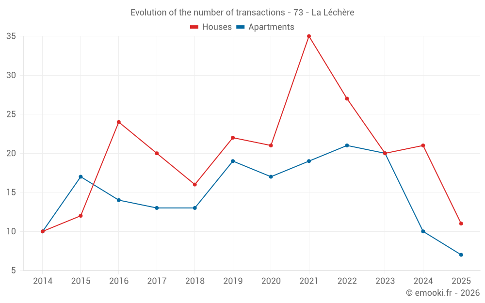 The median price on the 17 house transactions of the last 12 months in the municipality of La Léchère was 2 585 € per square meter for a median property value of 232 520 €. Over this period, 60% of transactions were between 1 649 and 3 914 € per square meter (from the 2nd to the 8th deciles).