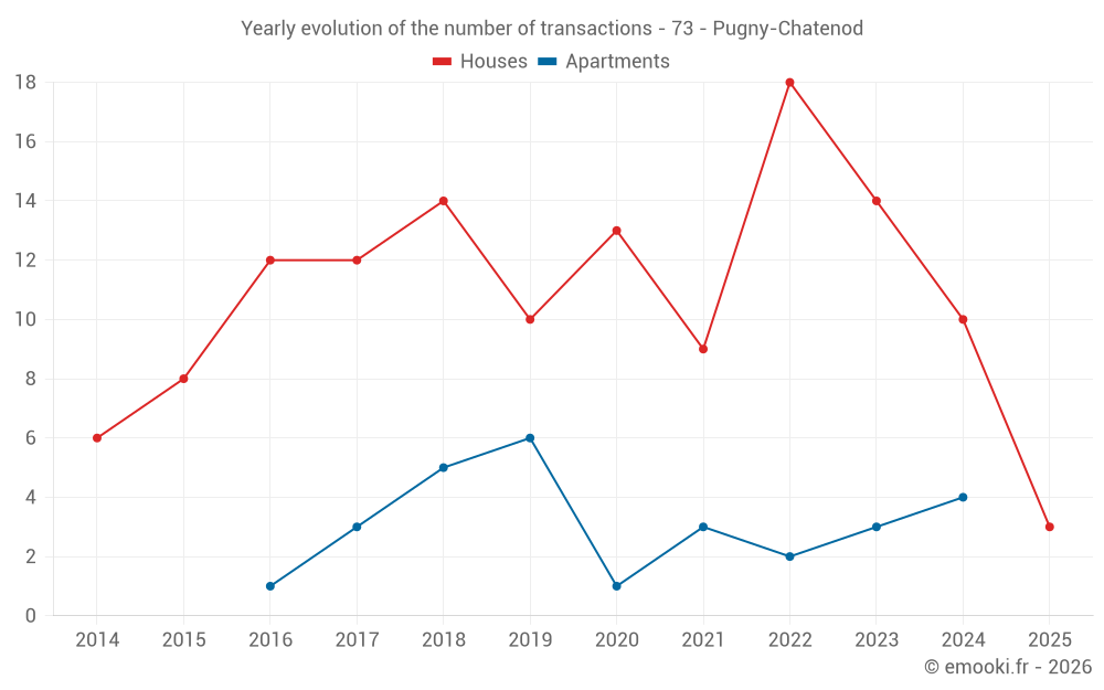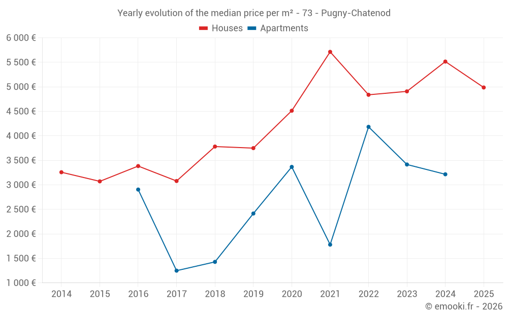The median price on the 20 house transactions of the last 24 months in the municipality of Pugny-Chatenod was 5 056 € per square meter for a median property value of 519 600 €. Over this period, 60% of transactions were between 3 760 and 6 043 € per square meter (from the 2nd to the 8th deciles).