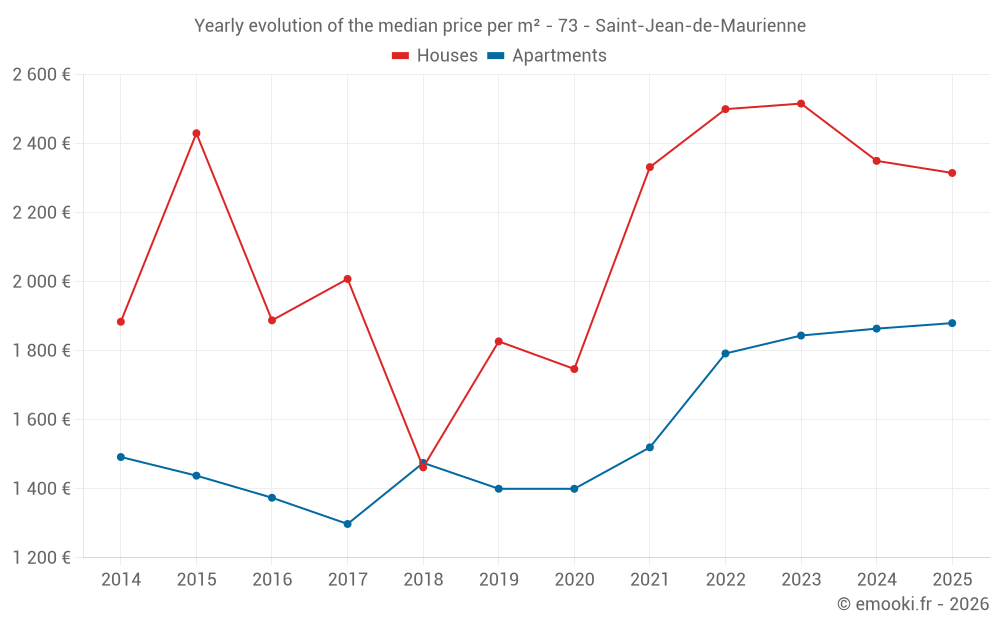 The median price on the 17 house transactions of the last 12 months in the municipality of Saint-Jean-de-Maurienne was 2 350 € per square meter for a median property value of 225 670 €. Over this period, 60% of transactions were between 1 746 and 3 466 € per square meter (from the 2nd to the 8th deciles).