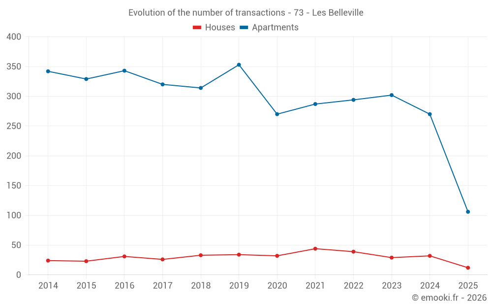 The median price on the 31 house transactions of the last 12 months in the municipality of Les Belleville was 5 160 € per square meter for a median property value of 414 552 €. Over this period, 60% of transactions were between 2 489 and 10 390 € per square meter (from the 2nd to the 8th deciles).