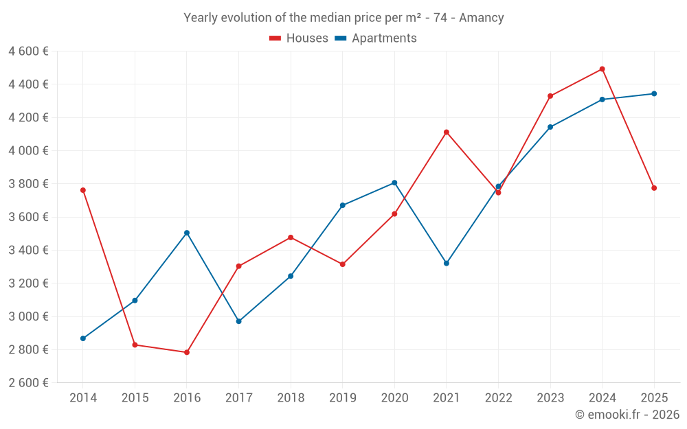 The median price on the 24 apartment transactions of the last 24 months in the municipality of Amancy was 4 275 € per square meter for a median property value of 312 225 €. Over this period, 60% of transactions were between 3 636 and 4 522 € per square meter (from the 2nd to the 8th deciles).