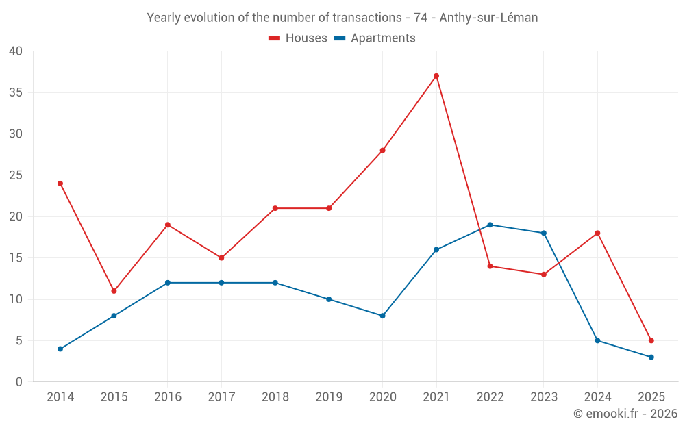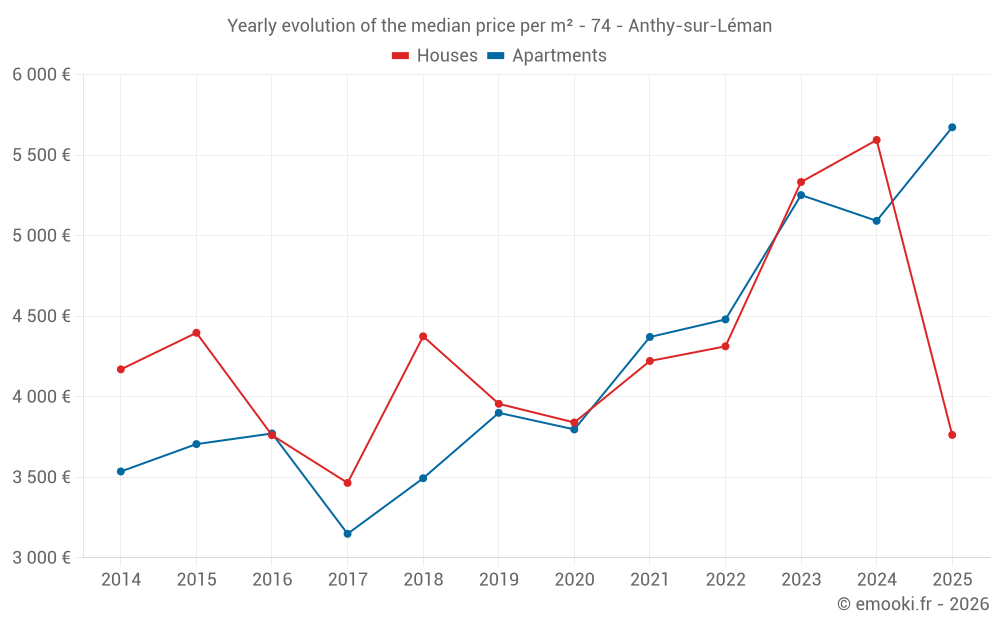 The median price on the 16 apartment transactions of the last 24 months in the municipality of Anthy-sur-Léman was 5 336 € per square meter for a median property value of 273 000 €. Over this period, 60% of transactions were between 4 628 and 5 848 € per square meter (from the 2nd to the 8th deciles).