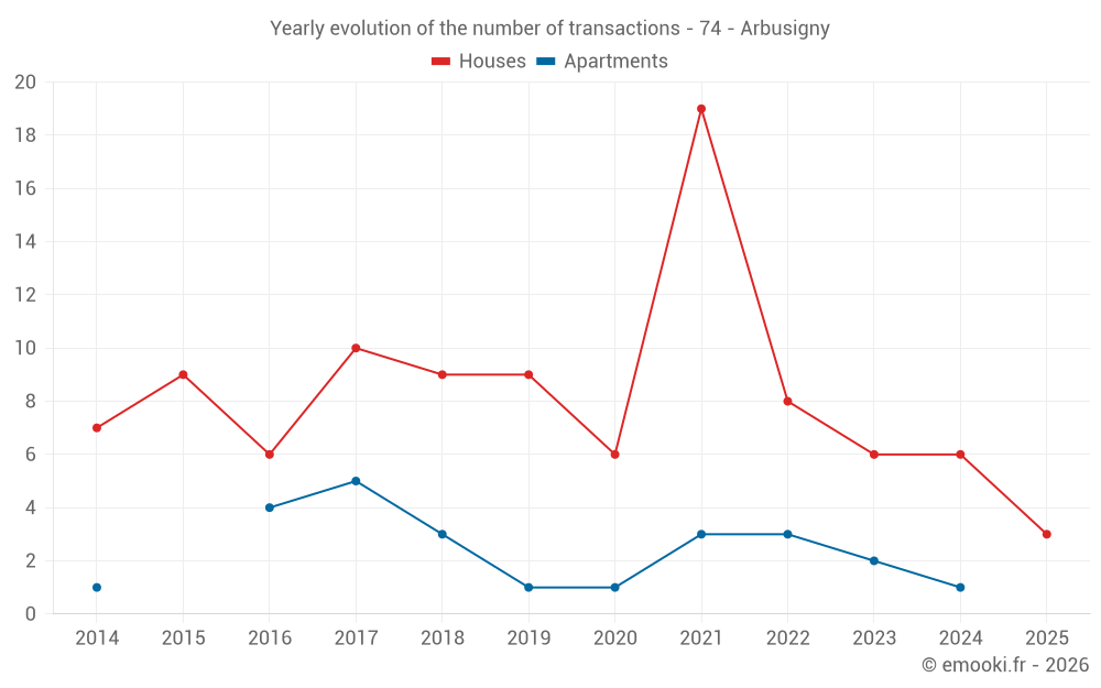 The median price on the 14 house transactions of the last 24 months in the municipality of Arbusigny was 4 085 € per square meter for a median property value of 472 500 €. Over this period, 60% of transactions were between 3 562 and 4 852 € per square meter (from the 2nd to the 8th deciles).