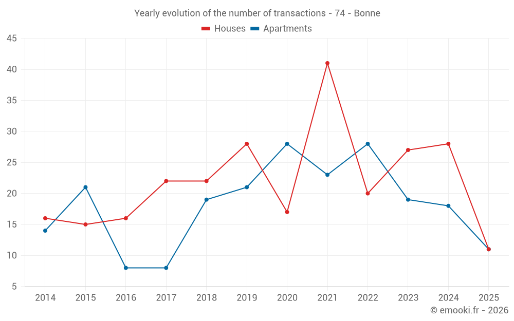 The median price on the 25 house transactions of the last 12 months in the municipality of Bonne was 3 973 € per square meter for a median property value of 370 000 €. Over this period, 60% of transactions were between 2 501 and 5 213 € per square meter (from the 2nd to the 8th deciles).