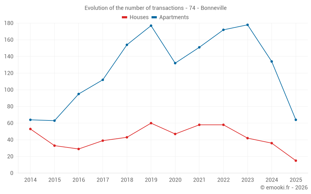 The median price on the 39 house transactions of the last 12 months in the municipality of Bonneville was 3 490 € per square meter for a median property value of 350 000 €. Over this period, 60% of transactions were between 2 601 and 4 282 € per square meter (from the 2nd to the 8th deciles).