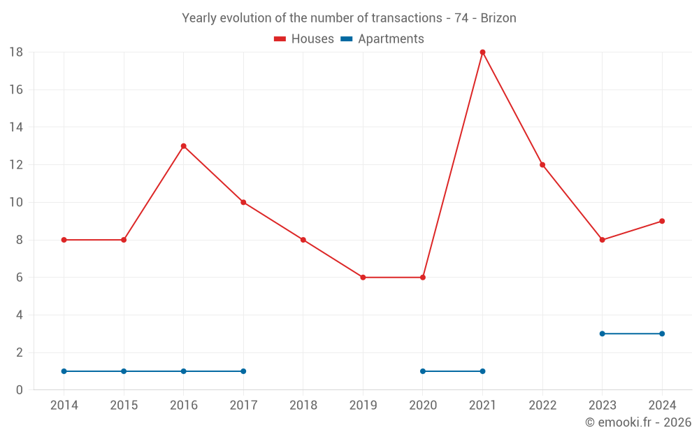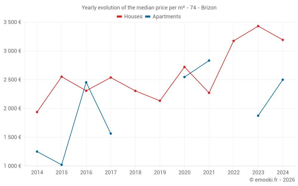 The median price on the 14 house transactions of the last 24 months in the municipality of Brizon was 3 200 € per square meter for a median property value of 181 000 €. Over this period, 60% of transactions were between 1 762 and 5 480 € per square meter (from the 2nd to the 8th deciles).