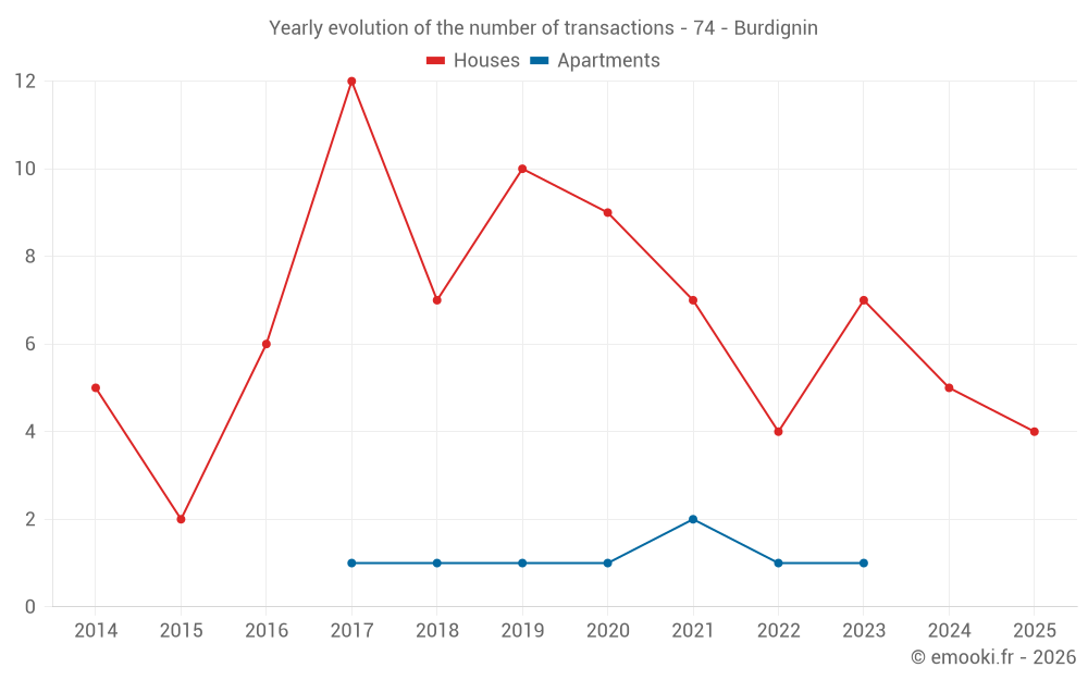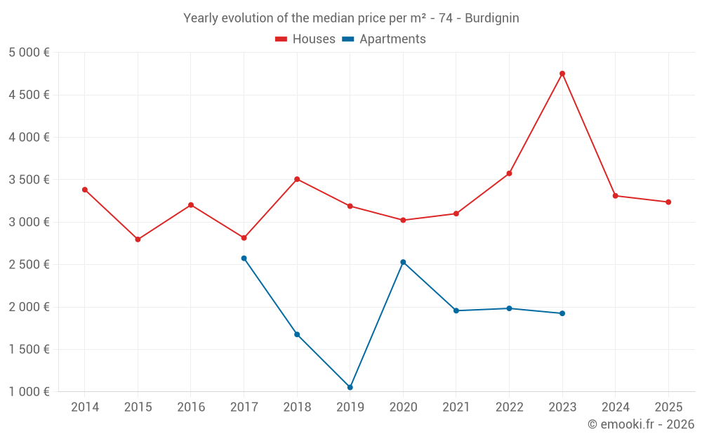 The median price on the 14 house transactions of the last 24 months in the municipality of Burdignin was 3 415 € per square meter for a median property value of 302 125 €. Over this period, 60% of transactions were between 2 344 and 4 937 € per square meter (from the 2nd to the 8th deciles).