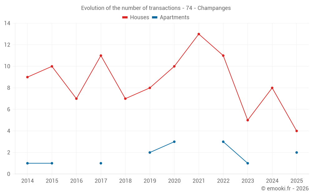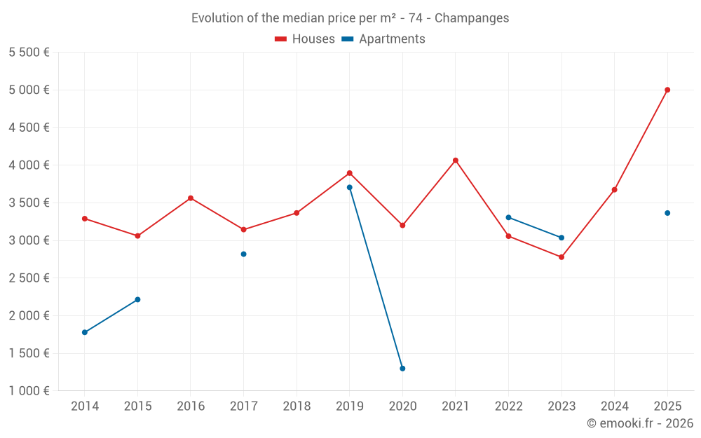 The median price on the 16 house transactions of the last 24 months in the municipality of Champanges was 4 012 € per square meter for a median property value of 394 036 €. Over this period, 60% of transactions were between 2 778 and 4 892 € per square meter (from the 2nd to the 8th deciles).