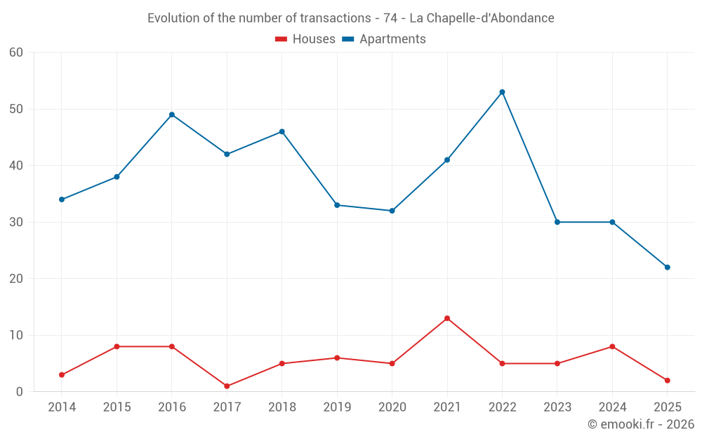 The median price on the 22 apartment transactions of the last 6 months in the municipality of La Chapelle-d'Abondance was 4 546 € per square meter for a median property value of 154 075 €. Over this period, 60% of transactions were between 3 949 and 5 431 € per square meter (from the 2nd to the 8th deciles).