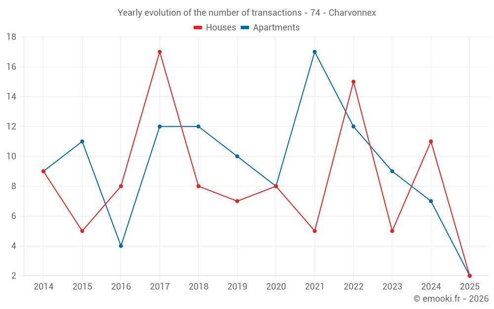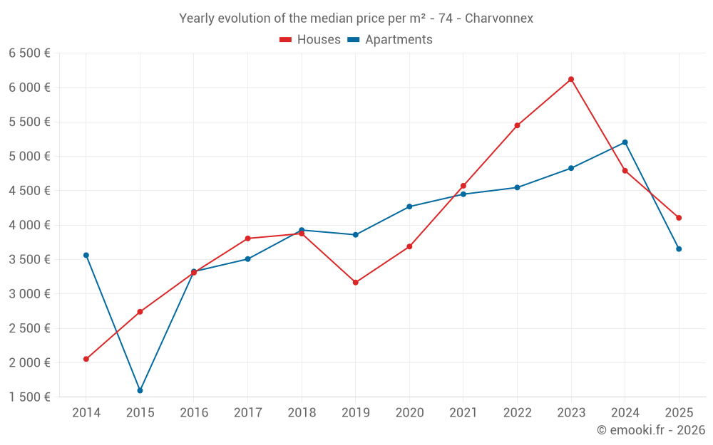 The median price on the 16 apartment transactions of the last 24 months in the municipality of Charvonnex was 4 924 € per square meter for a median property value of 325 100 €. Over this period, 60% of transactions were between 3 626 and 5 254 € per square meter (from the 2nd to the 8th deciles).