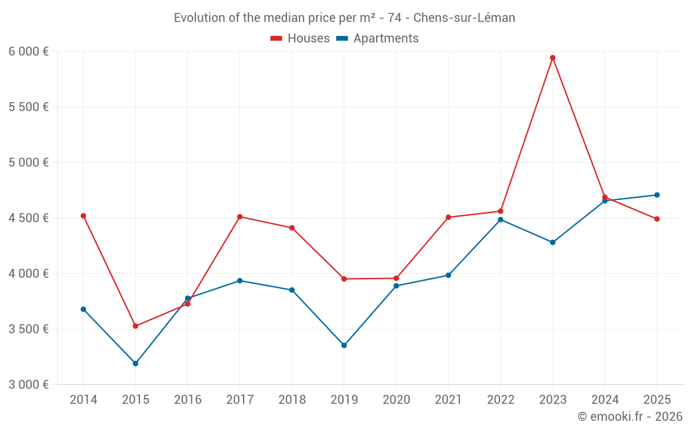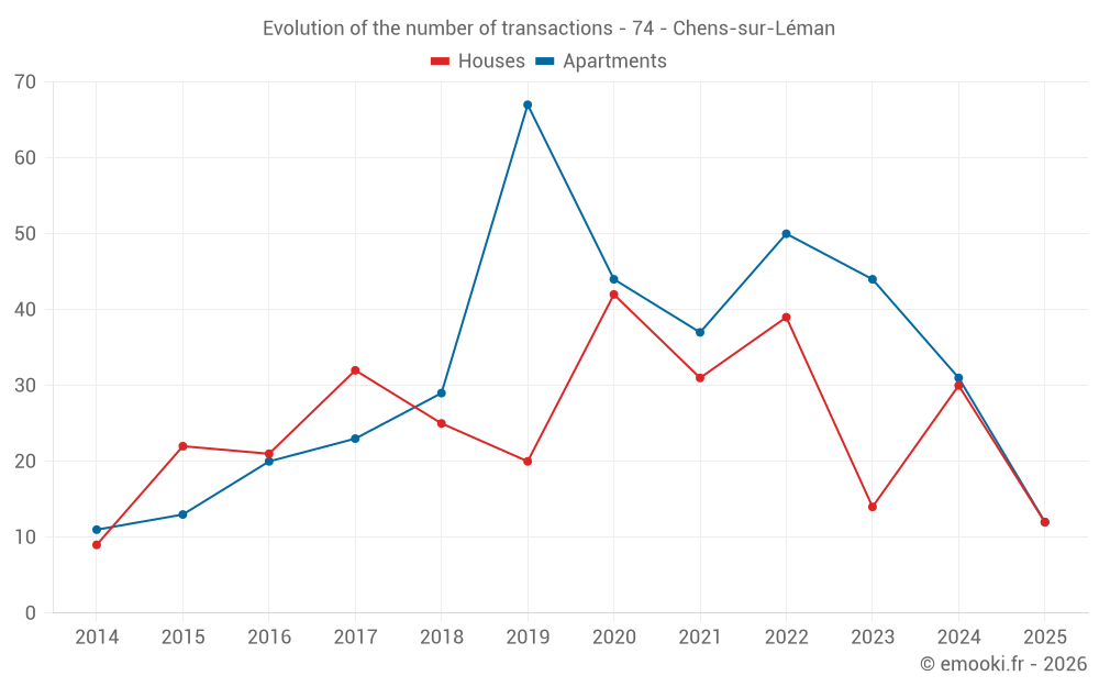 The median price on the 31 house transactions of the last 12 months in the municipality of Chens-sur-Léman was 4 615 € per square meter for a median property value of 600 000 €. Over this period, 60% of transactions were between 3 961 and 8 582 € per square meter (from the 2nd to the 8th deciles).