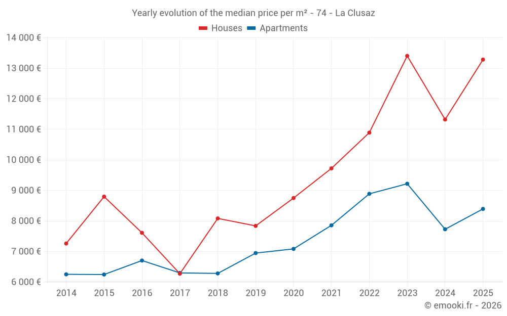 The median price on the 28 house transactions of the last 24 months in the municipality of La Clusaz was 13 070 € per square meter for a median property value of 1 271 625 €. Over this period, 60% of transactions were between 7 733 and 15 352 € per square meter (from the 2nd to the 8th deciles).