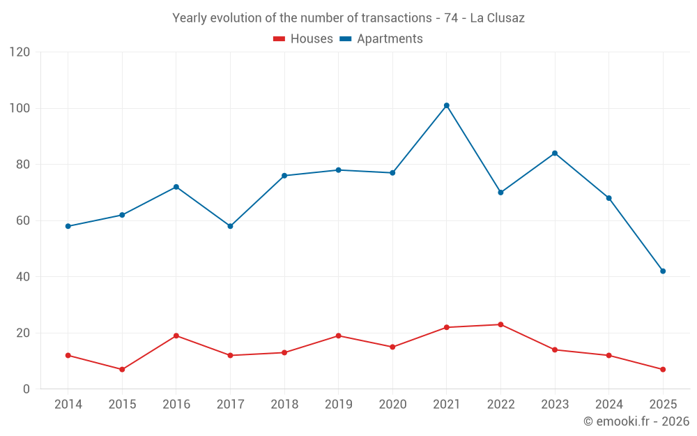 The median price on the 42 apartment transactions of the last 6 months in the municipality of La Clusaz was 8 394 € per square meter for a median property value of 335 665 €. Over this period, 60% of transactions were between 6 367 and 10 181 € per square meter (from the 2nd to the 8th deciles).
