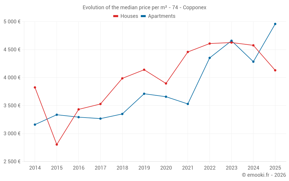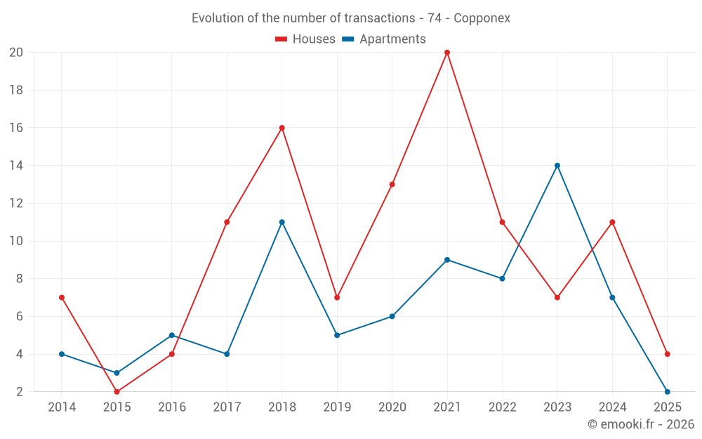 The median price on the 20 house transactions of the last 24 months in the municipality of Copponex was 4 490 € per square meter for a median property value of 646 015 €. Over this period, 60% of transactions were between 3 557 and 5 101 € per square meter (from the 2nd to the 8th deciles).