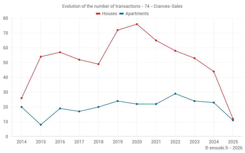 The median price on the 30 house transactions of the last 12 months in the municipality of Cranves-Sales was 4 762 € per square meter for a median property value of 477 132 €. Over this period, 60% of transactions were between 3 881 and 5 333 € per square meter (from the 2nd to the 8th deciles).
